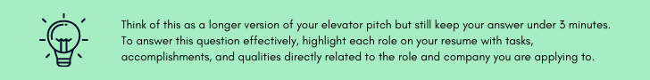 Insight: This is almost always the first question and interviewees tend to struggle to answer it. Since the question is broad, people tend to get lost as they discuss their work experience and speak with no direction or strategy.