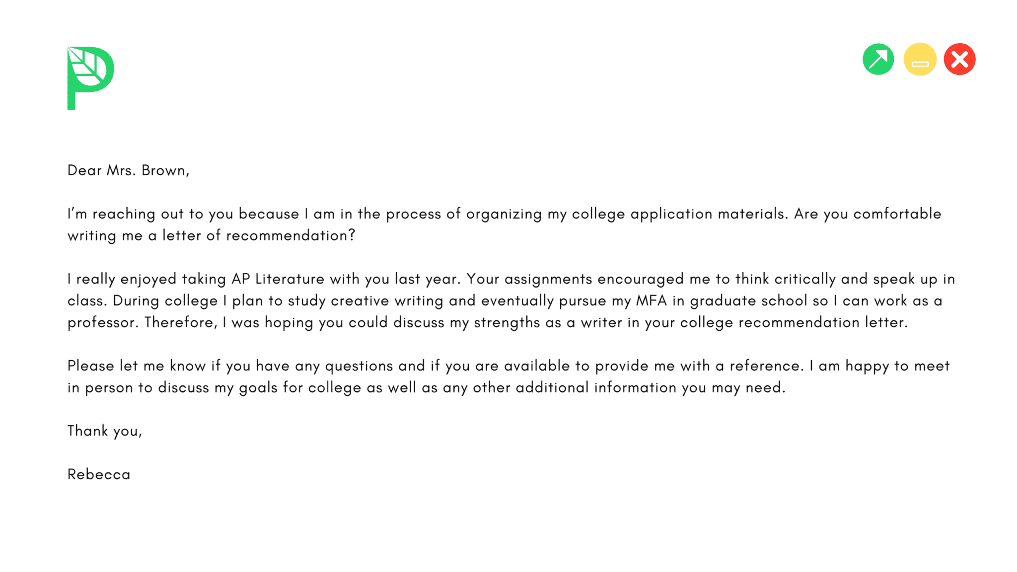 I’m reaching out because I’m applying for college and am in the process of organizing my written application materials. Are you willing and able to write me a letter of recommendation?
