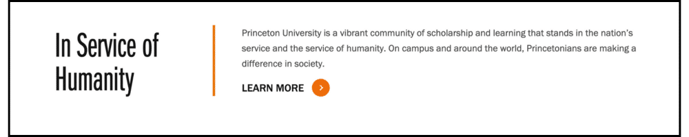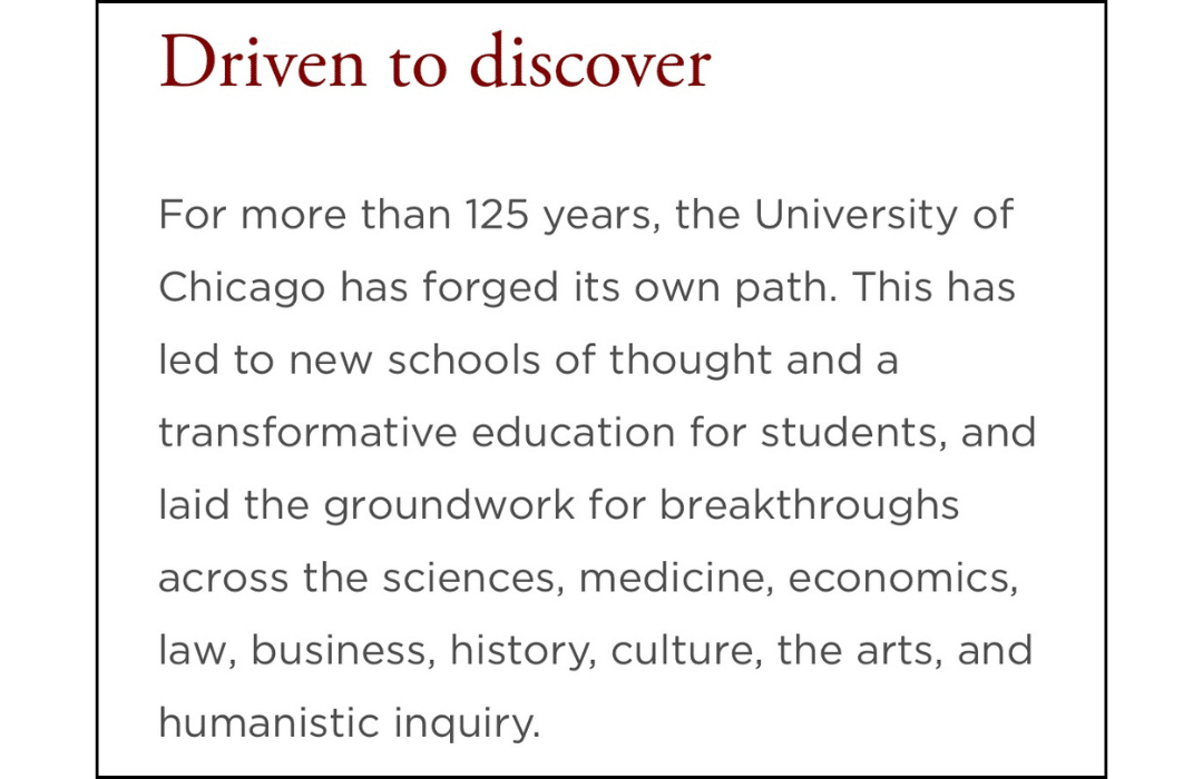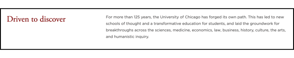In a short paragraph, both of these universities have attempted to distill their vibe to prospective students and families. Did you catch the subtle differences? Drive vs. Service. New schools of thought vs. Making a difference.