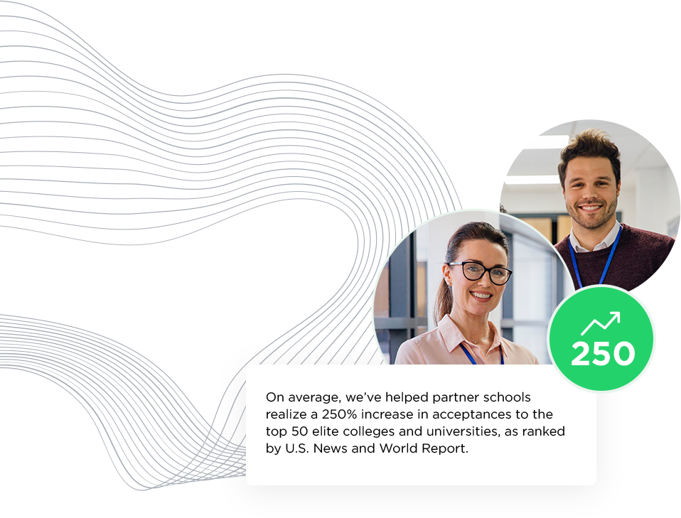 On average, we've helped partner schools realize a 250% increase in acceptances to the top 50 elite colleges and universities, as ranked by U.S. News and World Reprot.